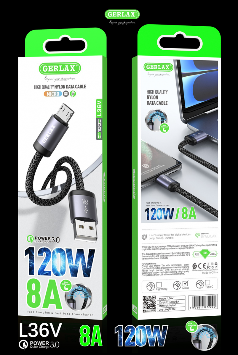 Cáp dù sạc nhanh Gerlax L36 là sự lựa chọn hoàn hảo cho những ai cần một sợi cáp bền bỉ và hiệu suất cao. Với thiết kế dây bện nylon chắc chắn, cáp có độ dẻo dai tốt, chống xoắn rối và chịu lực nén hiệu quả, giúp kéo dài tuổi thọ sử dụng. Gerlax L36 hỗ trợ đa dạng các chuẩn sạc, gồm L36V (Micro USB), L36T (Type-C),L36L (Lightning), đáp ứng nhu cầu sạc cho nhiều thiết bị khác nhau. Đặc biệt, cáp hỗ trợ dòng điện lên đến 8A, cung cấp công suất tối đa 120W trên Android30W trên iOS, giúp rút ngắn đáng kể thời gian sạc, mang đến trải nghiệm sạc nhanh chóng và tiện lợi.