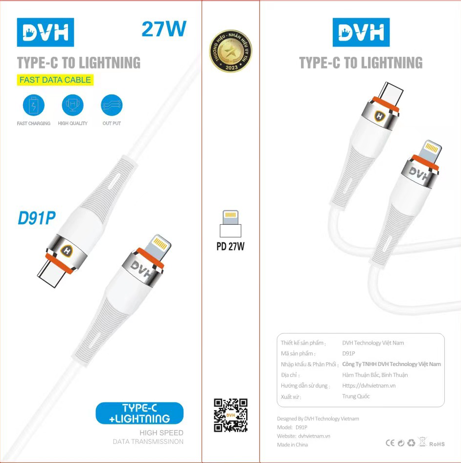 - Cáp sạc nhanh DVH D91 27W(Type-C to Lightning) / 66W(Type-C to Type-C)là thế hệ cáp sạc C to Lightning mới nhất của DVH. Sản phẩm được thiết kế chuyên dụng cho các dòng iPhone. Đảm bảo tốc độ sạc nhanh, độ ổn định cao và tương thích tuyệt đối với các dòng iPhone.