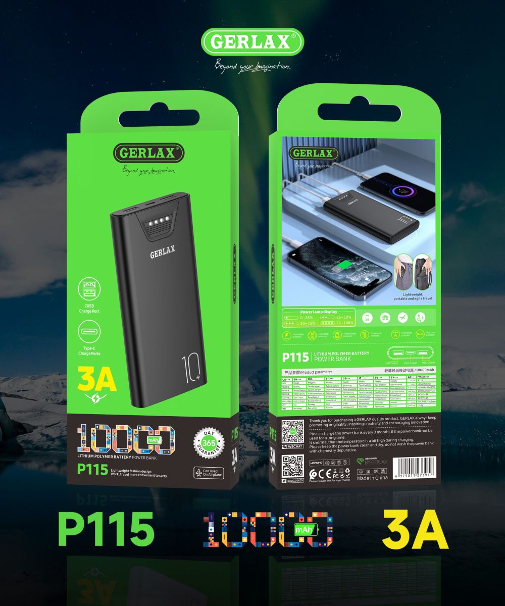 Sạc dự phòng Gerlax P115 với dung lượng pin 10.000mAh là giải pháp tiện lợi giúp bạn luôn duy trì năng lượng cho các thiết bị di động mọi lúc, mọi nơi. Với dung lượng 10.000mAh, sản phẩm có thể sạc đầy 2-3 lần cho điện thoại thông thường. Thiết kế nhỏ gọn, dễ dàng mang theo, cùng với nhiều cổng sạc tiện ích, đảm bảo an toàn với các công nghệ chống quá nhiệt, quá tải. Đây là phụ kiện không thể thiếu cho những ai thường xuyên di chuyển hoặc làm việc ngoài trời.